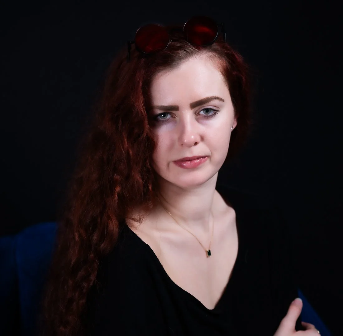 Jeune femme avec des cheveux blonds bouclés, portant un chemisier noir sur un fond gris.